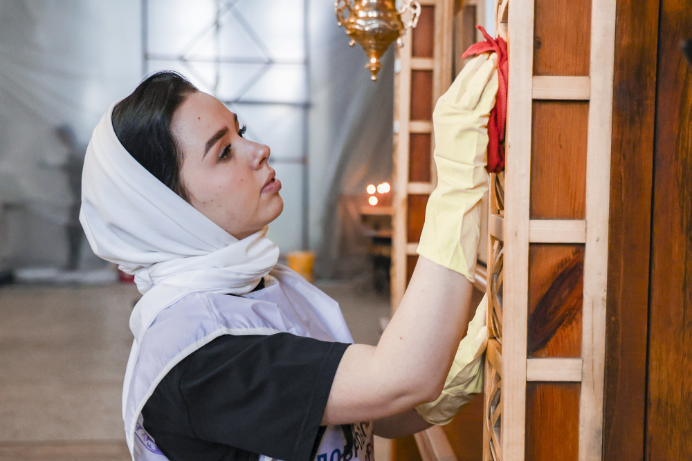 Работы начались с самого утра и охватили сразу несколько направлений. Волонтёры мыли окна и стеклянные поверхности, приводили в порядок церковную утварь и выполняли другие хозяйственные задачи, необходимые для подготовки собора к праздничным богослужениям.