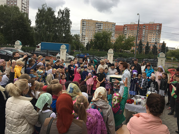На сегодняшний день приходская воскресная школа при храме в Солнцево насчитывает более 100 детей, которые 17 сентября встретились после летних каникул. Праздник начался с познавательного химического шоу, на котором все участники мероприятия смогли сами сделать газировку и воздушную пушку, используя сухой лед, раскрасить воду в разные цвета и вернуть ей первоначальный вид, поучаствовать в экспериментах с туманом и собственноручно сделать игрушку-лизуна. Особый интерес у зрителей вызвало шоу мыльных пузырей. Трюки с огнем, дымовые эффект, гигантские пузыри и мыльный салют вызвали шквал эмоций и аплодисментов, а интерактив с детьми и погружение в мыльный цилиндр надолго запомнились всем гостям праздника. Вместе с детьми интересовались и их родители.
