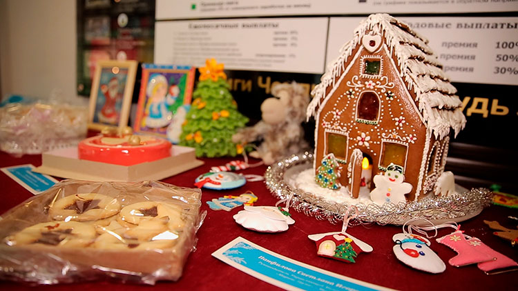 На выставке были представлены сладкие рождественские десерты, торты, пряничные домики и новогодние ели, выпечка с сахарной пудрой, песочные пирожные с вареньем, шоколадные кексы, декоративные композиции, украшенные бисером и жемчугом, ароматное мыло в форме новогодних игрушек, плетеные корзины с подарками и мягкие игрушки.