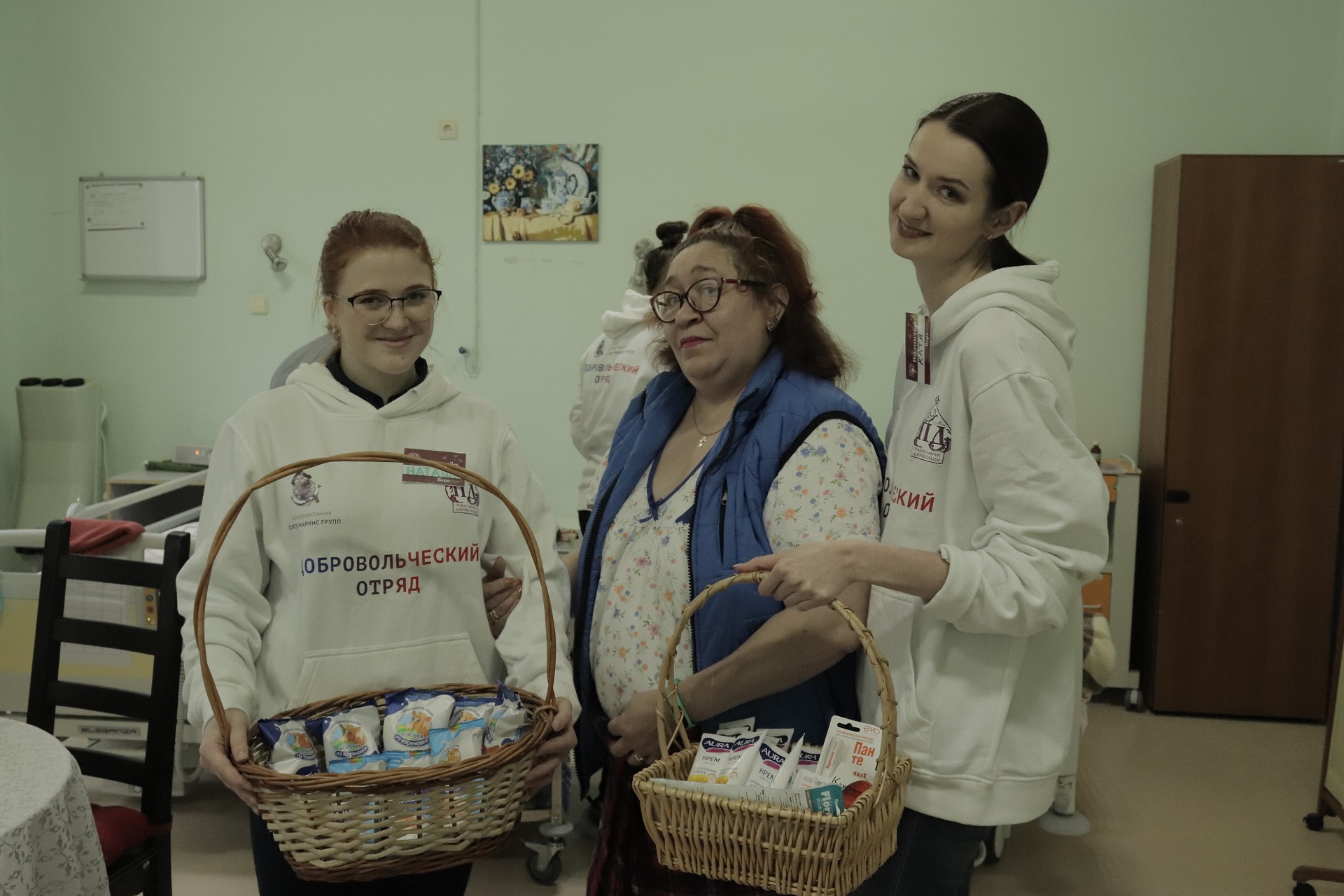 В этот день добровольцы кинокомпании «Союз Маринс Групп» привезли пациентам хосписа средства первой необходимости: кремы для рук, расчески, косметические помады, ватные палочки и диски, обеззараживающие влажные салфетки, а также другие предметы личной гигиены. Силами волонтеров были приготовлены диетические бутерброды с рыбными и колбасными изделиями, сыром и овощами. Не обошлось и без сладостей, которыми смогли угоститься угостили всех пожилые бабушки и дедушки. проживающих в хосписе .