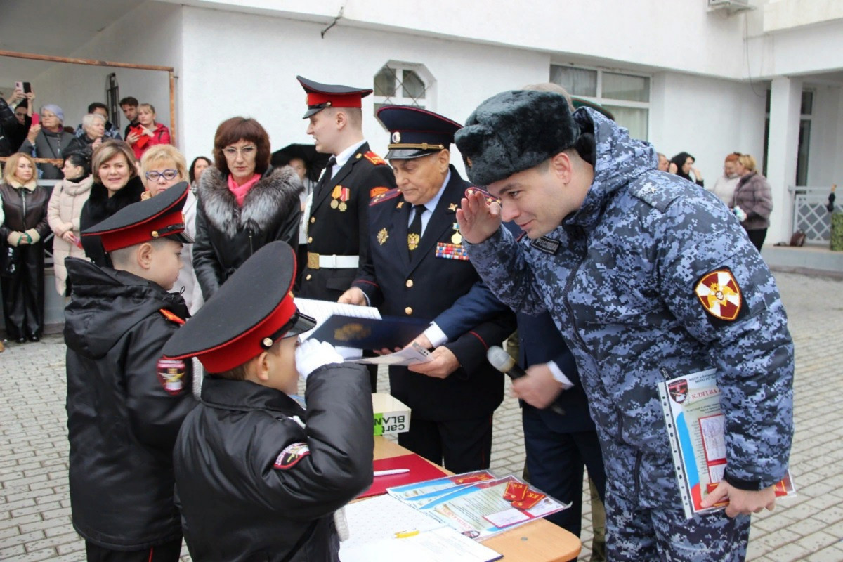 Перед бюстом Императора Александра III была принесена клятва воспитанников Кадетского корпуса – первоклассников, а также офицерами Управления МВД России по г. Ялта и войсковой части 6919 Росгвардии торжественно приведены к присяге двадцать пять новых кадет со второго по десятый классы. В соответствии с итогами аттестации кадетам присвоены в этот день очередные кадетские звания и знаки отличия.